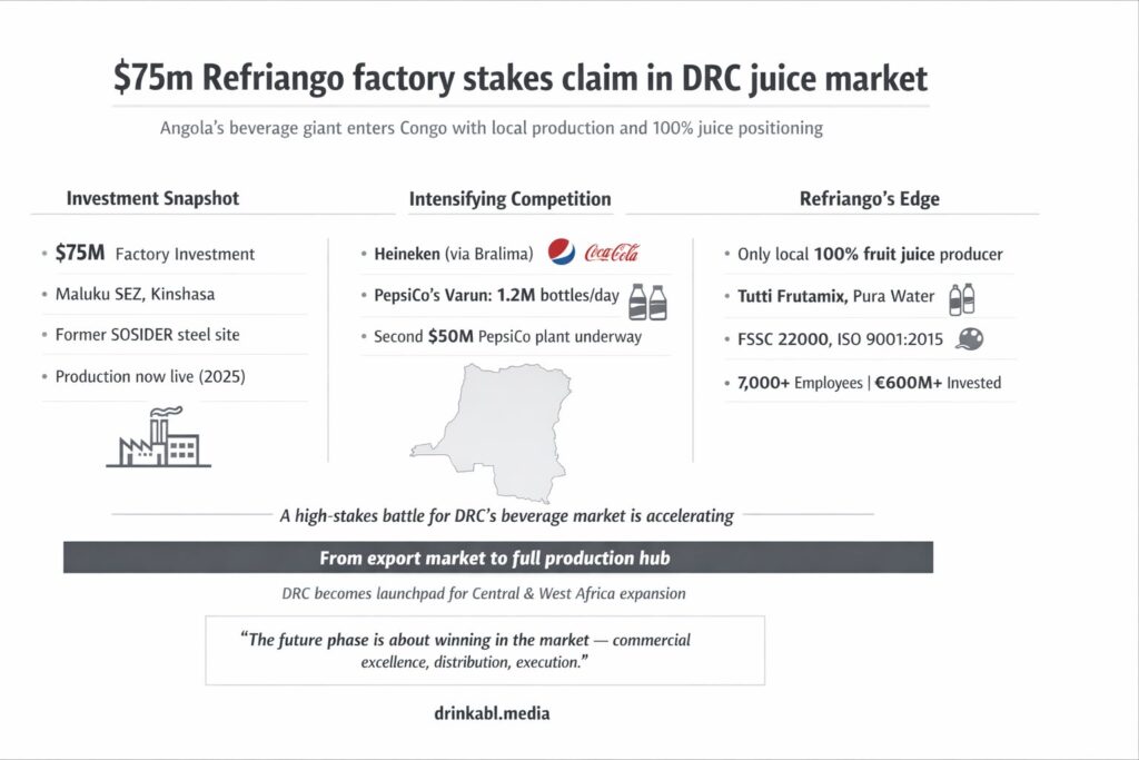 The launch lands in the middle of a fierce new contest for the DRC’s beverage market. In the DRC, Coca-Cola is bottled by Bralima, owned by Heineken, while Hyper Psaro handles the brand in Lubumbashi. That means Refriango enters the DRC not as a Coca-Cola partner but as an independent challenger, competing on its own brands in a market already crowded by global giants. Meanwhile, PepsiCo’s bottler Varun Beverages has operated a production site in Maluku since August 2024, producing up to 1.2 million bottles daily, and has since announced a second $50 million facility at the Kiswishi City SEZ near Lubumbashi, doubling down on the DRC opportunity.