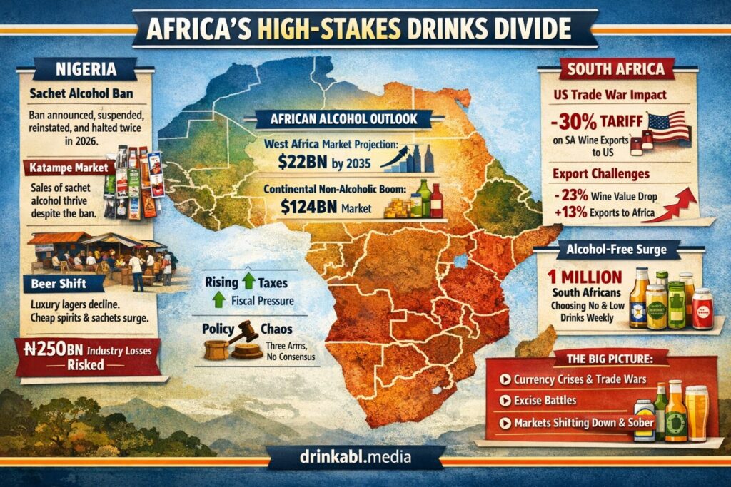 That scene, policy on paper, commerce on the street , is, in miniature, the story of Africa’s alcohol industry right now. A continent where the formal industry is fighting for survival under the weight of currency collapses, punishing excise regimes, and trade wars it didn’t start. And yet the actual drinking, formal, informal, sachet and bottle , continues largely on its own terms.
