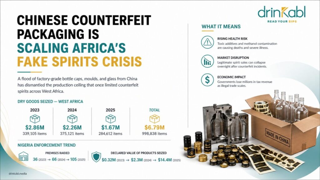 A flood of factory-grade bottle caps, moulds, and glass from China has dismantled the production ceiling that once limited counterfeit spirits across West Africa, with public health and fiscal consequences now measurable at nine-figure dollar values.