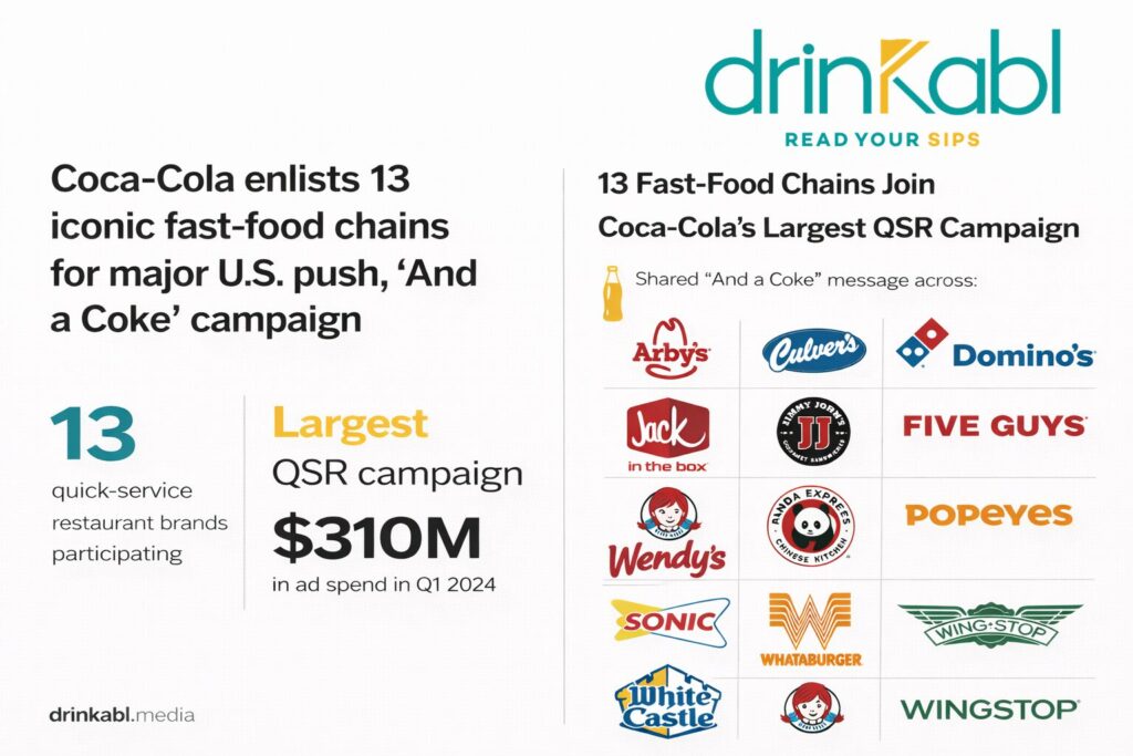 Coca-Cola has launched a new U.S. campaign called “And a Coke,” built around the idea that nothing completes a meal quite like the iconic red-labelled drink. For the first time, the beverage giant has united 13 iconic quick-service restaurant brands which includes Arby’s, Culver’s, Domino’s, Five Guys, Jack in the Box, Jimmy John’s, Panda Express, Popeyes, Sonic, Wendy’s, Whataburger, White Castle and Wingstop in a single national effort. The campaign is described as both a Coca-Cola first and a broader milestone.