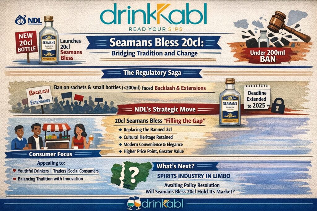 Nigerian Distilleries Limited (NDL), the country’s largest manufacturer of spirits and wines, has launched Seamans Bless, a new 20cl bottled expression of its iconic Seaman’s Aromatic Schnapps brand. Company executives describe it as a bold consumer innovation; the regulatory calendar tells a more complex story.