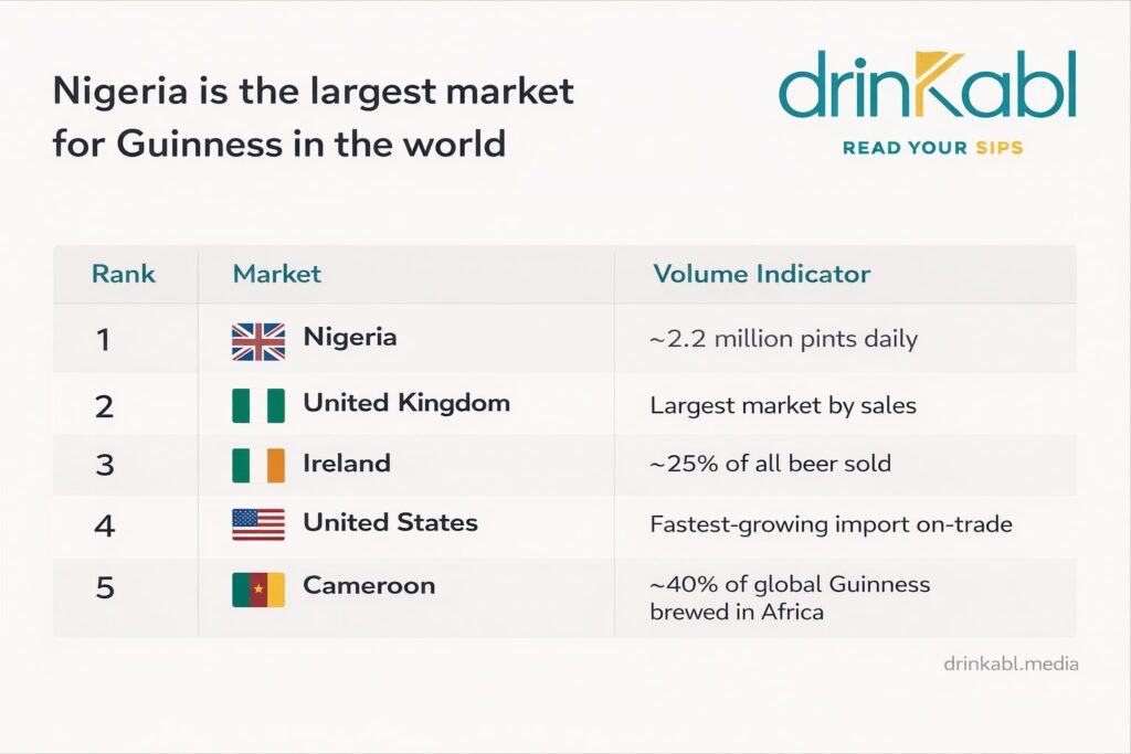 The verified answer, confirmed by Diageo’s own top-market data, is the United Kingdom, by a considerable distance. Roughly one in every ten pints sold in Britain is a Guinness, and the brand has grown to become the most popular draught beer in the United Kingdom. Ireland ranks third. Wedged between them, in second place, is Nigeria, a fact that surprises most Western audiences but surprises nobody in Lagos.