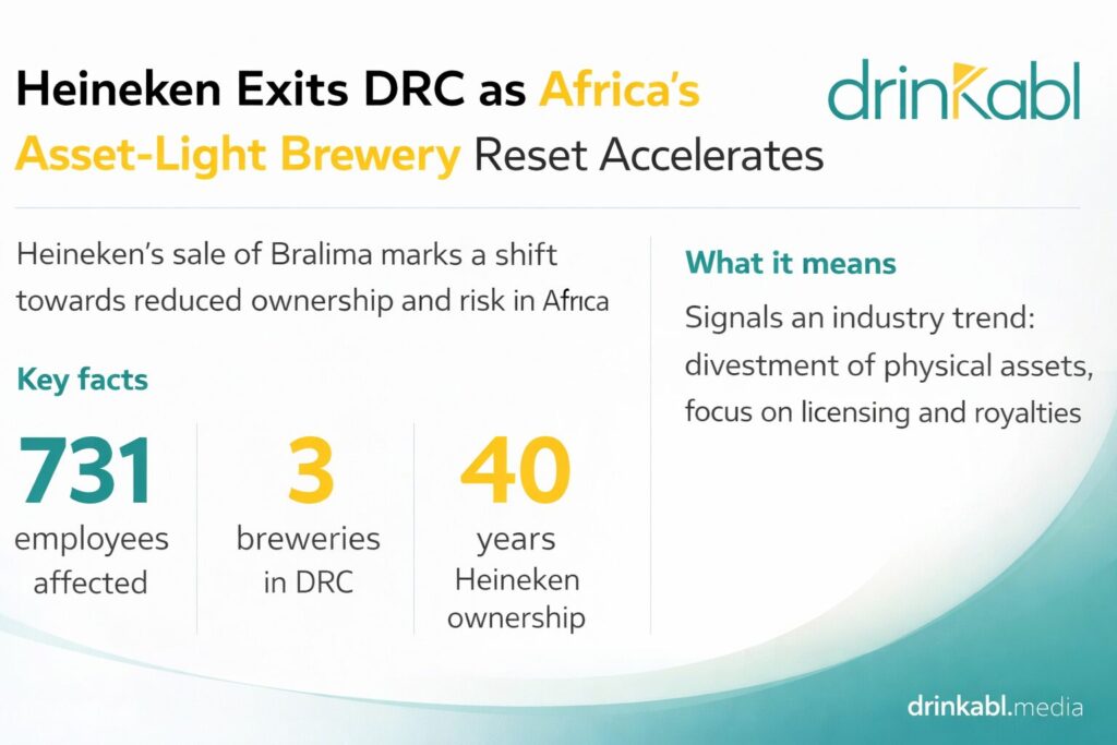 Forty years after acquiring majority control of the DRC’s largest brewer, Heineken has sold the business outright, the latest move reshaping how global drinks multinationals operate across the continent.
