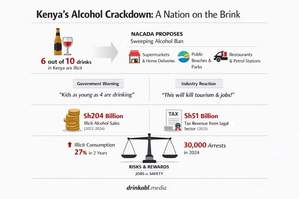 Kenya’s anti-drug authority has put nearly every retail channel for alcohol on notice, and the industry says the cure could be worse than the disease. This comes on the heels of a report we published showing illicit alcohol already accounts for six in ten drinks consumed in the country, casting doubt on whether tighter rules on legal sellers will move the needle at all.