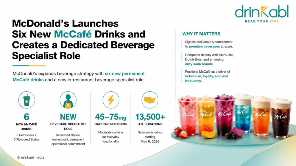 The broader portfolio logic here connects to what Drinkabl.media has tracked across the non-alcoholic beverage segment, where Starbucks and its competitors have shown that beverage customisation drives both ticket size and visit frequency. McDonald’s has historically underperformed on beverage revenue relative to its food volume. McCafé has existed for years as the vehicle to close that gap, but the menu has rarely matched the format innovation happening at dedicated beverage chains. The May launch is the most substantive attempt yet to change that, backed by operational infrastructure, specifically the beverage specialist role, that earlier beverage menu additions lacked.
