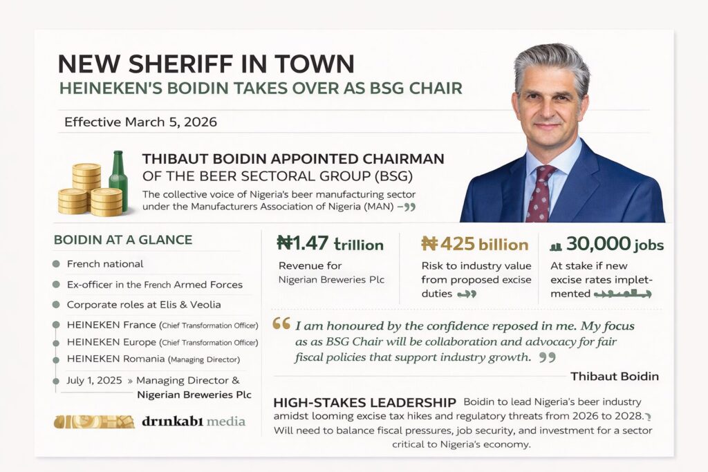 Thibaut Boidin, Managing Director and CEO of Nigerian Breweries Plc, has been appointed Chairman of the Beer Sectoral Group (BSG), the collective voice of Nigeria’s beer manufacturing sector operating under the Manufacturers Association of Nigeria, effective March 5, 2026. He succeeds Carlos Coutino, who led the BSG through a bruising period of naira devaluation and rising input costs before stepping down.
