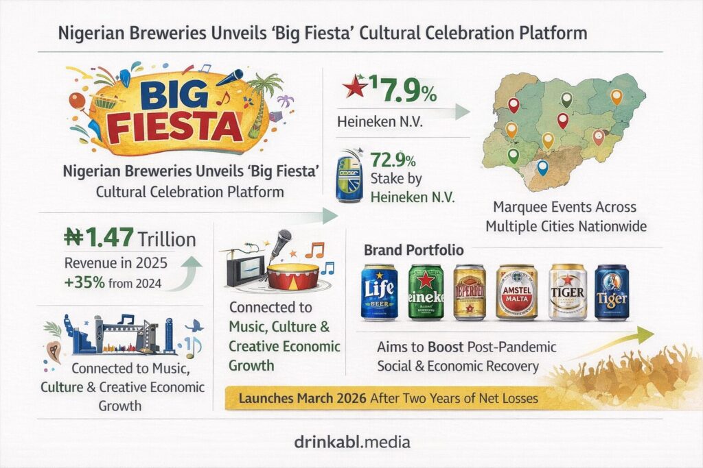 The brewer, in which Heineken N.V. holds approximately 72.90%, posted a revenue of ₦1.467 trillion for the full year 2025, a 35% jump from 2024 and a hard-won rebound after two years of heavy losses. Big Fiesta is a direct follow-up to Legendary Christmas, the platform that powered the company’s Detty December push last year. It is designed to capture what the company describes as the first true social wave of the year, when Nigerians emerge from the early-year lull, travel home, reconnect, and return to concerts and festivals.
