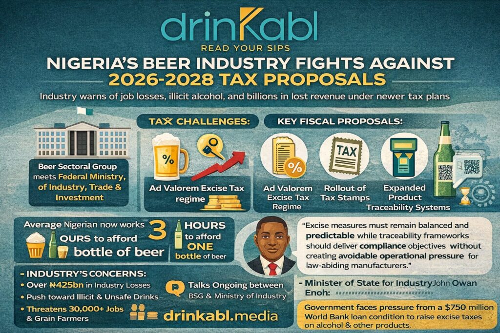 Nigeria’s brewing sector has escalated its campaign against the proposed 2026–2028 excise duty framework, with the Beer Sectoral Group (BSG) , the industry body representing Nigerian Breweries, Guinness Nigeria, and International Breweries, taking its case directly to the Federal Ministry of Industry, Trade and Investment. The group engaged Minister of State John Owan Enoh in Abuja, flanked by tax and policy specialists from PwC Nigeria, in what observers described as one of the most substantive brewery-government engagements in recent years.