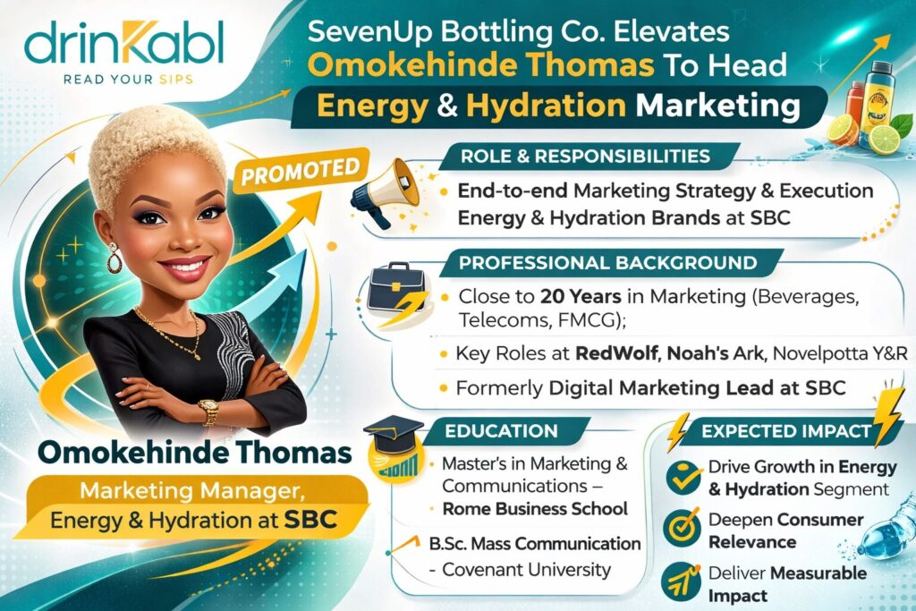 SevenUp Bottling Company (SBC) has promoted Omokehinde Thomas to Marketing Manager for its Energy and Hydration portfolio, recognising her contributions to the company and positioning her to drive the next phase of growth in one of the beverage industry’s most competitive categories.