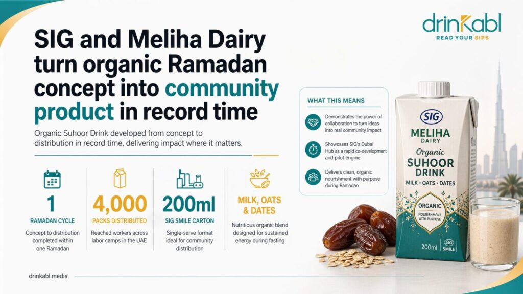 Against that backdrop, SIG and Meliha Dairy, an organic brand produced under Sharjah’s Ektifa agricultural authority, converged on a brief that was both time-bound and community-oriented. The result was an Organic Suhoor Drink, a nutritious blend of organic milk, oats and dates packaged in a SIG Smile 200ml carton, designed to sustain energy during fasting hours. Approximately 4,000 packs were distributed across labor camps in the UAE, reaching workers through the fasting period.