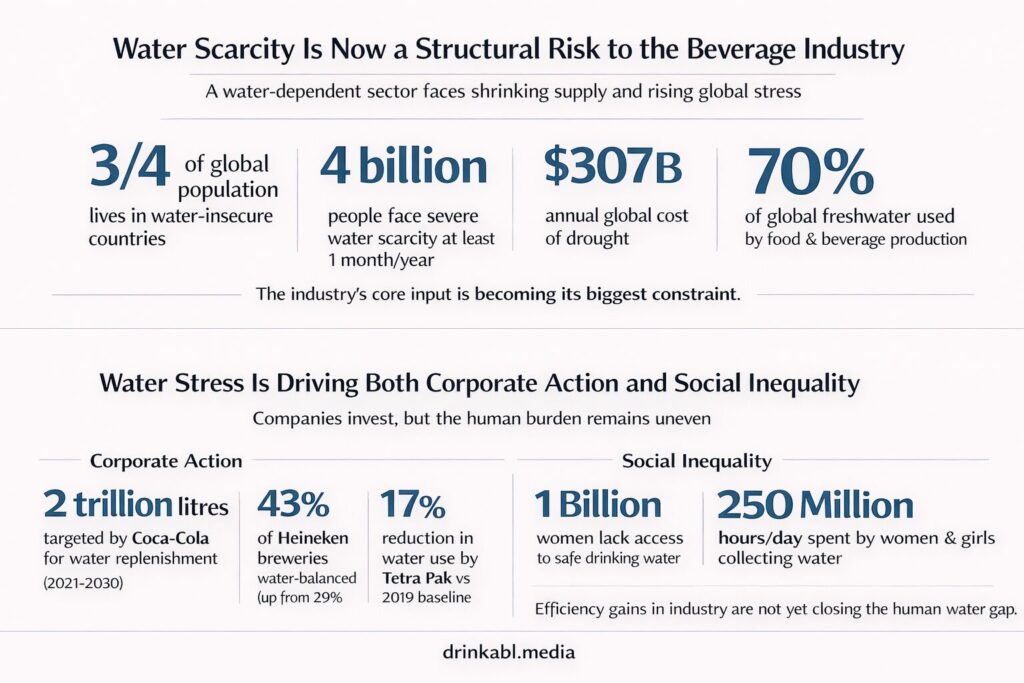 In January, the UN University’s Institute for Water, Environment and Health issued a landmark verdict: humanity has crossed into an era of global water bankruptcy, a point where depleted water systems can no longer return to their historical baselines. Nearly three-quarters of the global population now lives in countries classified as water-insecure. Around 4 billion people face severe water scarcity for at least one month per year. Drought costs the world an estimated $307 billion annually. The $6 trillion global food and beverage sector sits squarely at the epicentre, consuming around 70% of the world’s freshwater to grow and manufacture its products.