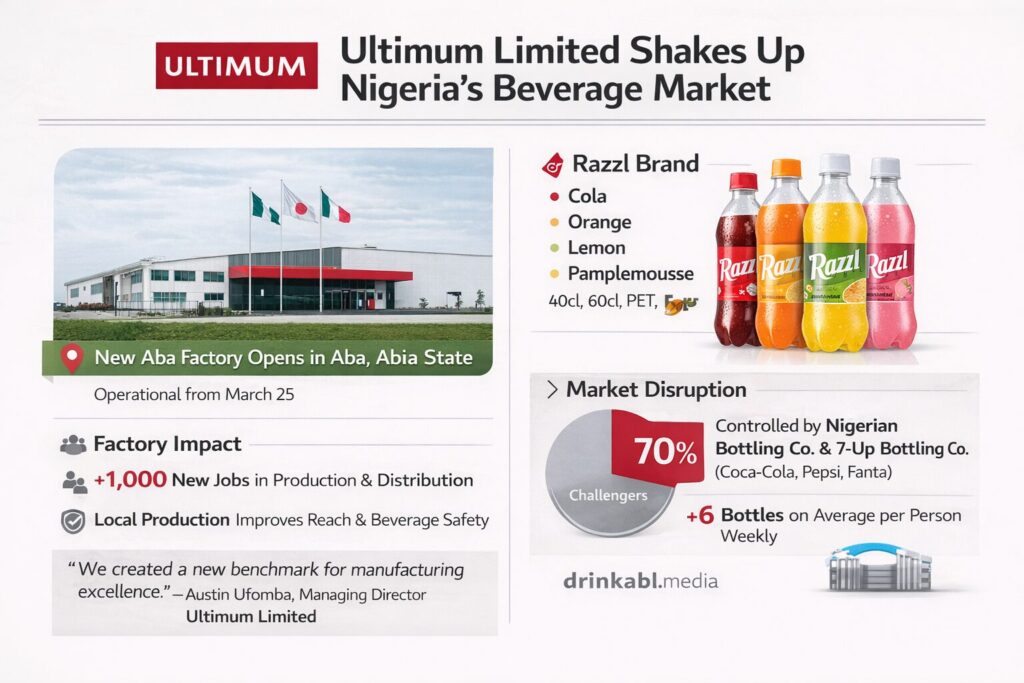 Ultimum Limited, the maker of the Razzl brand of carbonated soft drinks, formally commissioned its brand-new state-of-the-art manufacturing facility in Aba, Abia State, in a ceremony attended by Governor Alex Otti and senior federal and state government officials. The move cements Aba’s re-emergence as a serious industrial hub and drops a competitive gauntlet in one of Africa’s most fiercely contested soft drink markets.