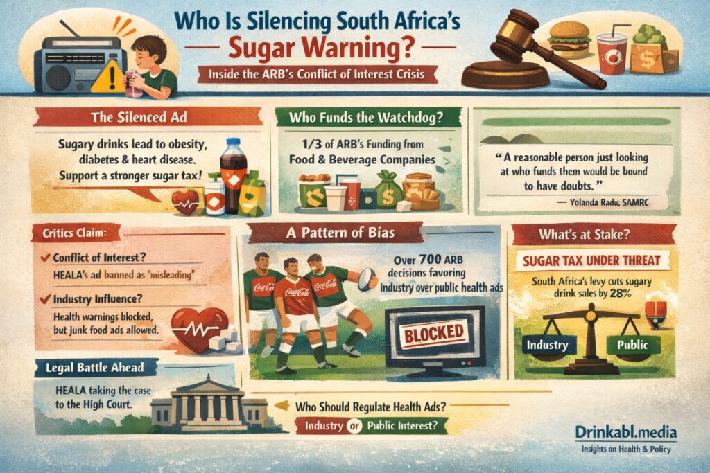 South Africa’s main advertising watchdog has banned a public-health ad warning that sugary drinks contribute to obesity, diabetes and heart disease, a decision critics say exposes how the industry itself can stifle health messaging. The ad, which aired on national radio and urged support for a tougher sugar tax, was pulled after a single complaint led the Advertising Regulatory Board (ARB) to rule it “misleading,” even though public-health groups argue the message reflects established research on sugar’s harms
